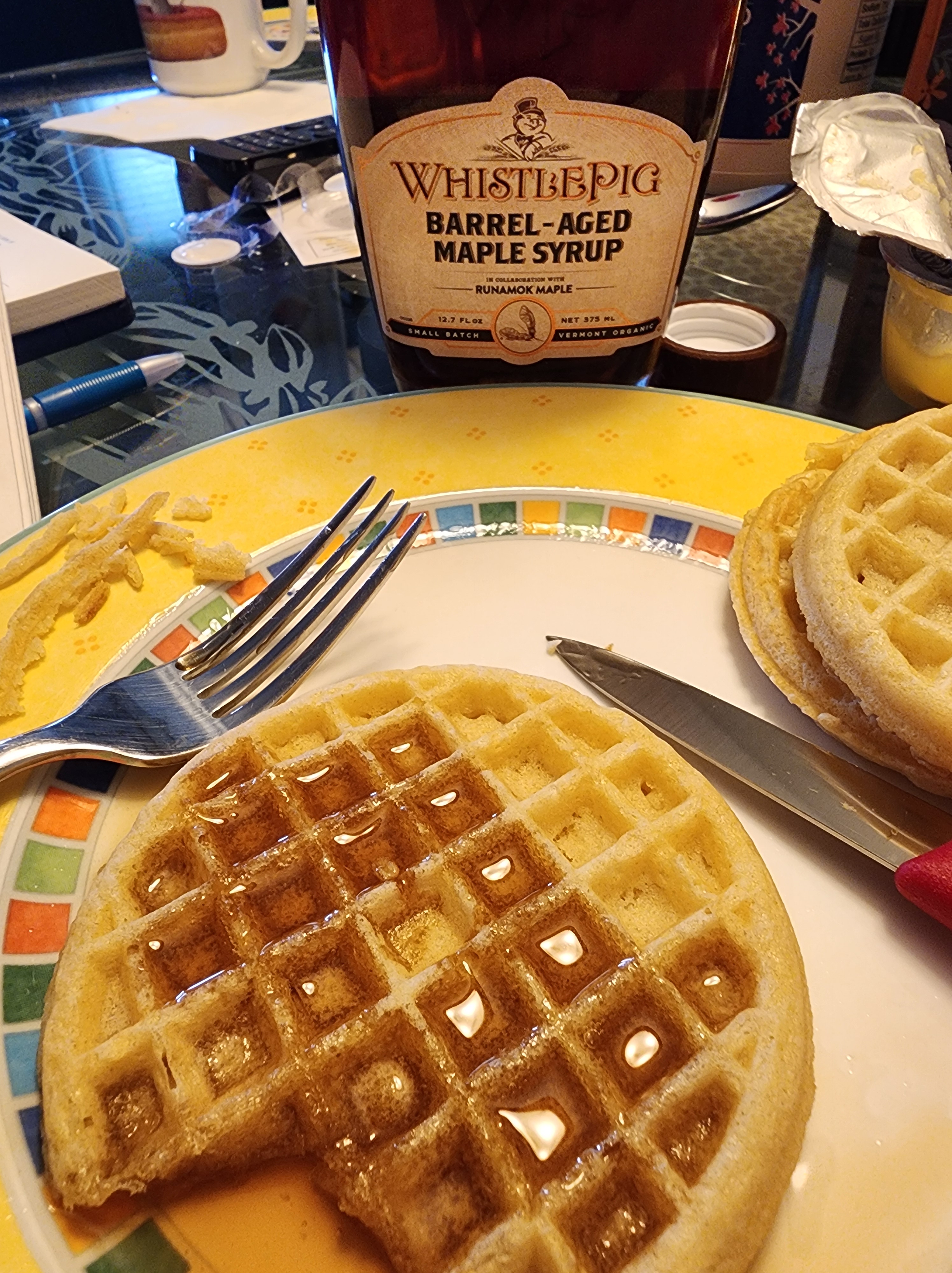 Sunday was another late start. I had my waffle breakfast and tried the Whistlepig syrup – it was kind of interesting, and I was hoping I would get drunk, but that did not happen. After, Amy decided to go to BJ’s to get more stuff we needed, and I went to our gym. I then showered and decided to shave. Well, that is now getting tougher as I needed both hands to stop my hands from shaking. Amy returned with a lot of stuff, and then we took a short trip to my parent’s house—I had not seen them for a long time. I had a personal pizza Amy made for me that night, and then I relaxed.