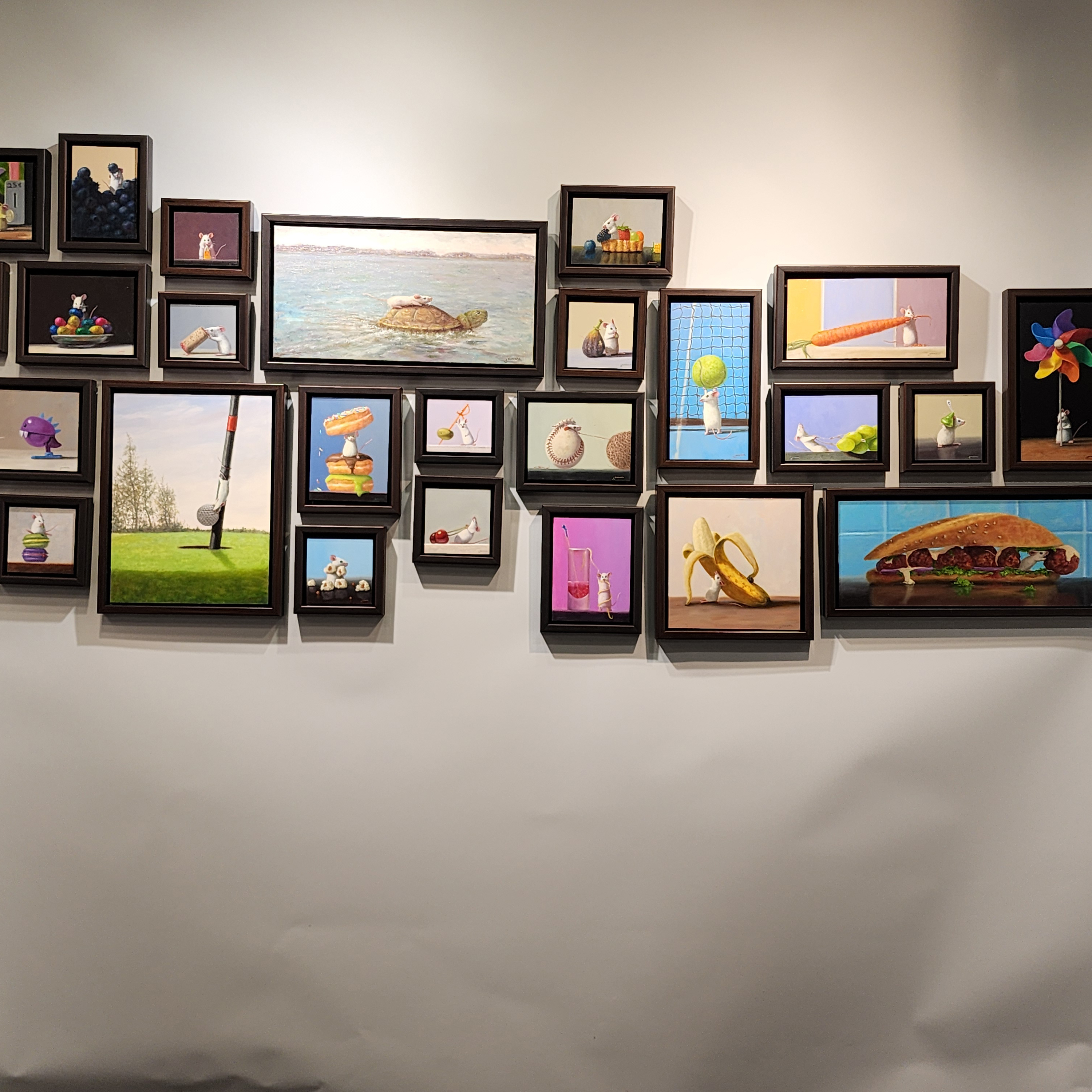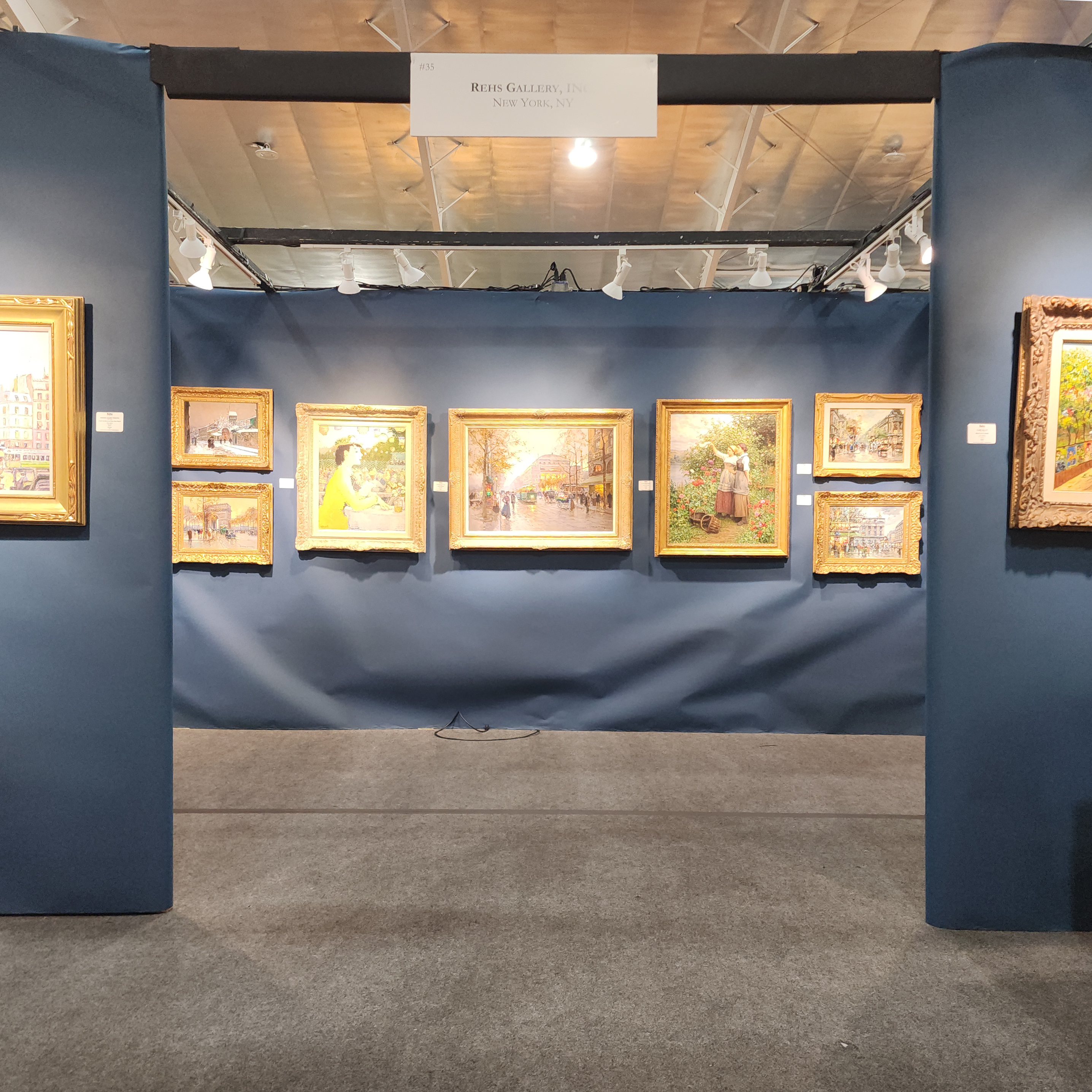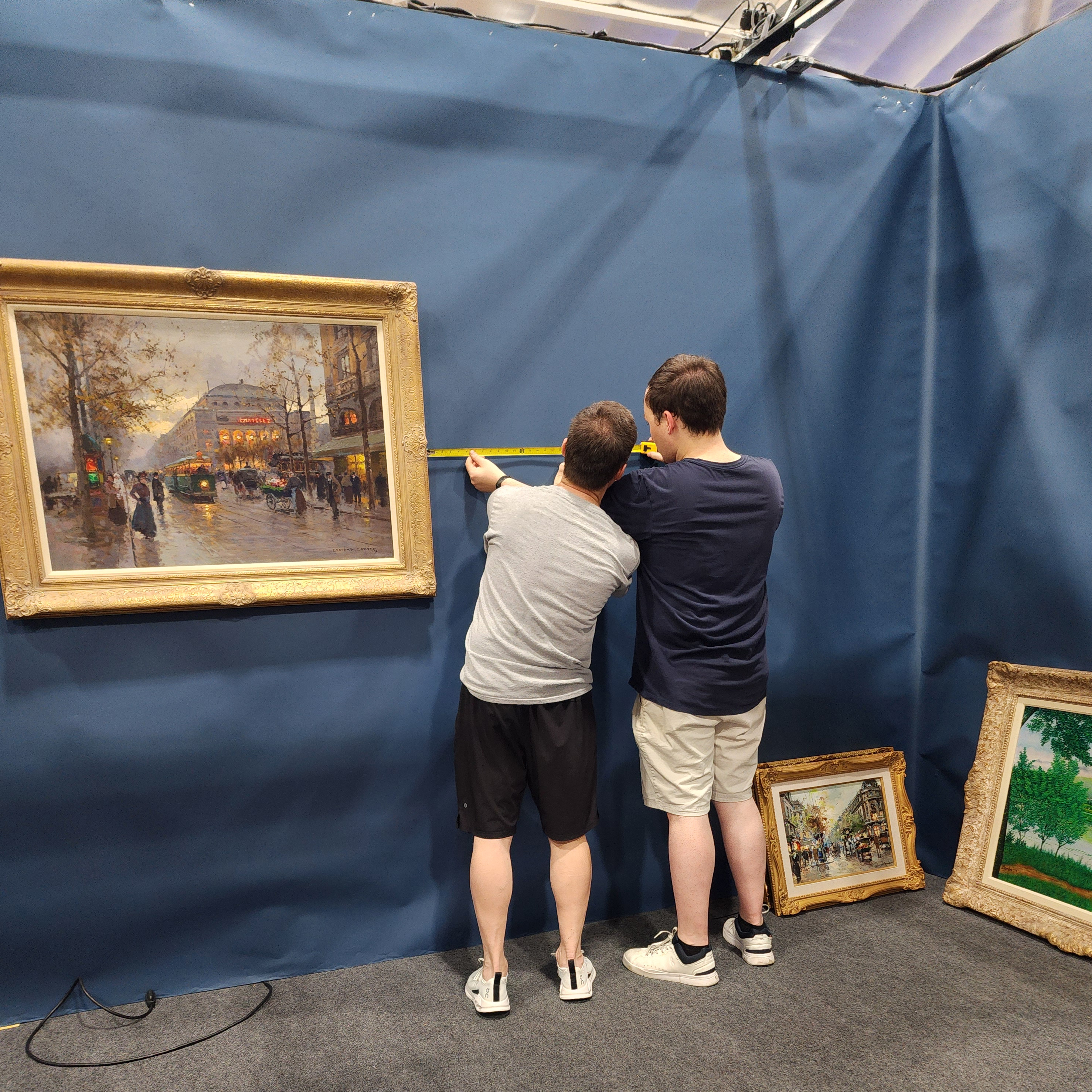 On Thursday, I woke up twice and did my best to ensure the urinal would work correctly; sadly, it did not. I woke up at five and took the Radicava, then went back to sleep and woke up after 8:00. Finally got up around 8:40. Amy took my wet pants off and then helped me get out of the crazy high bed, we showered, I brushed my teeth at the sink, had my breakfast, got dressed, and we were heading to the show by about 11:15. When we got there the family finished the three sections of the contemporary side, including the Dunkel space – Stu will the there tomorrow to paint at the show.
