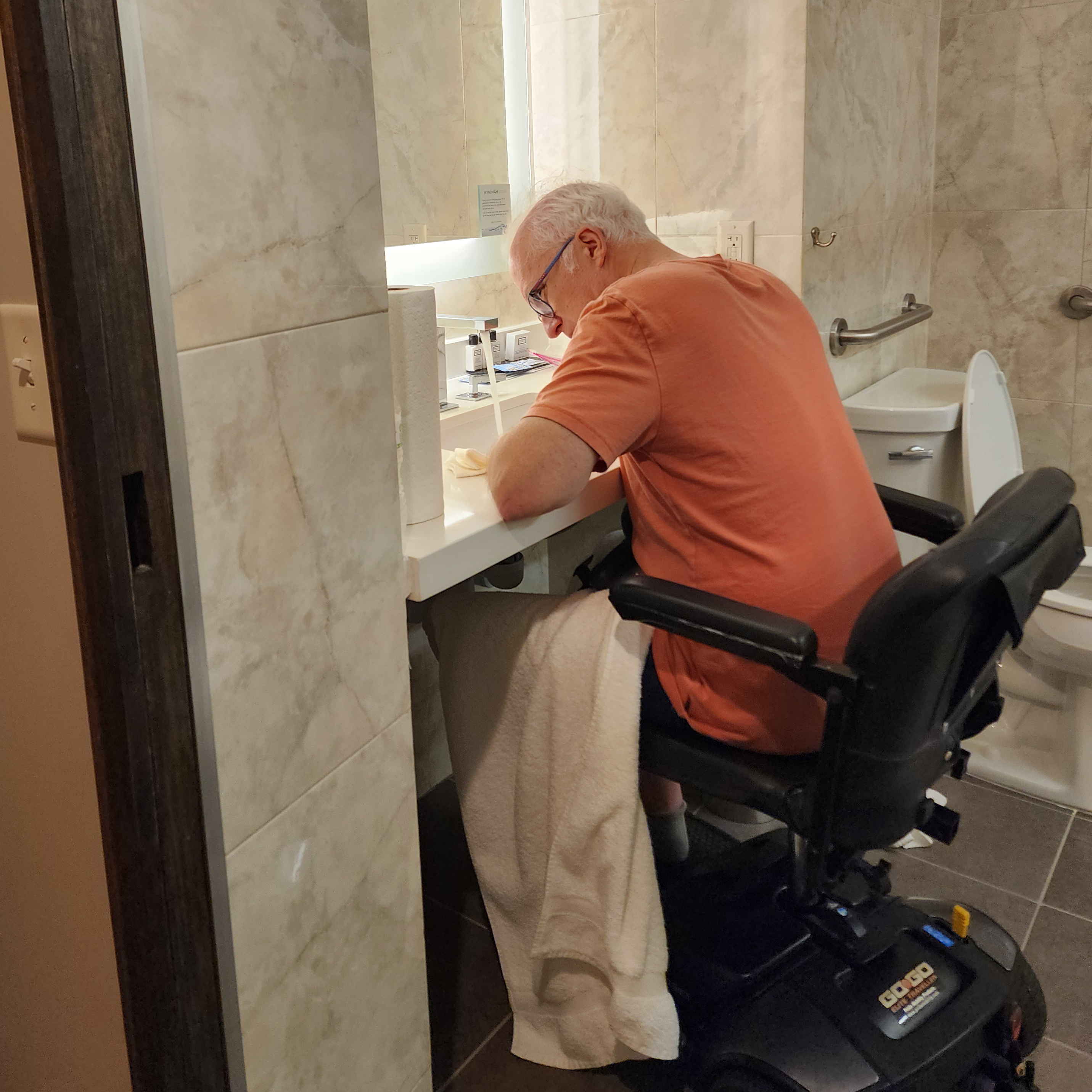Wednesday, I took the Radicava at 6:30 and had to deal with a wet sheet and underwear. Amy finally got up and helped me get everything off. She also assisted me in getting up and helped me to the shower, where she washed me. I used the sink to brush my teeth (the scooter could fit underneath it), and then I had breakfast, and we went to the show. Lance was on his way up to Newport.