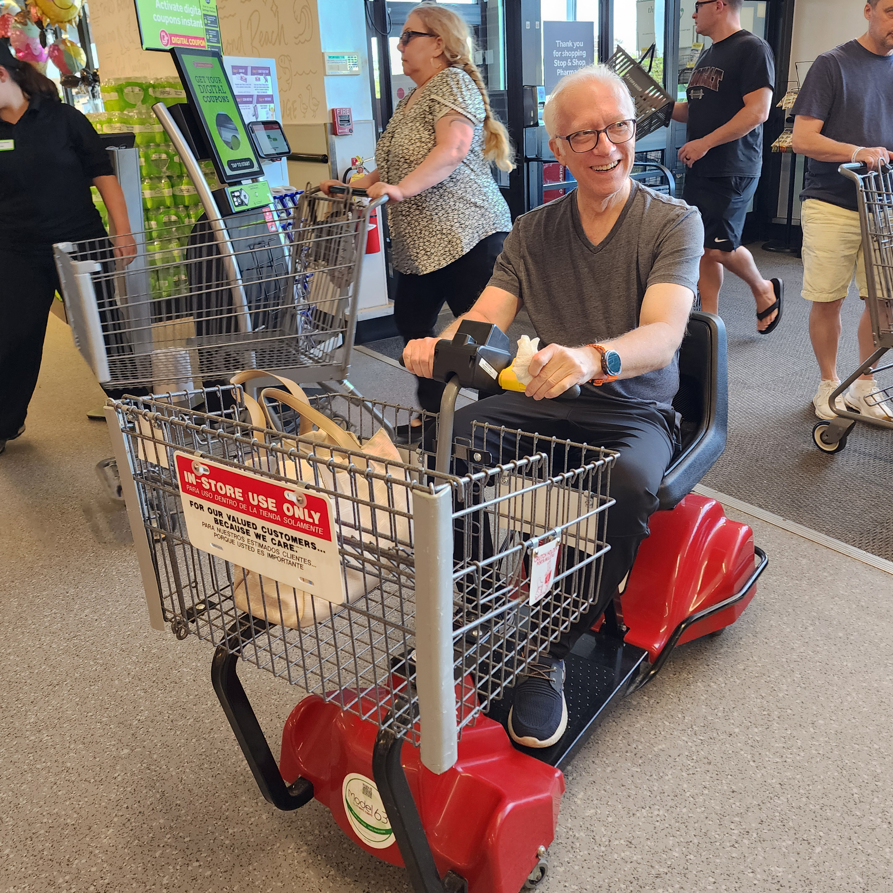 After Amy, Nathan & Neil checked out our booths, we headed to the supermarket. I got a supermarket scooter and went through the full market, something I hadn’t done in a long time. After we headed back to the hotel, Amy got me a kid’s order of spaghetti and meatballs from the restaurant at the hotel… then she pureed it. It was very nice. She went back to have dinner with her family, and then they brought ice cream for me so I could have the RSO. Finally tried to get into the high bed, which Amy helped me with. I would say that the height of the bed in an ADA-compliant bedroom is way too high. Amy also brought a lifting bed backrest. My problems were: a) when I turned on my side I was at the edge of the backrest, which was not good since my arms were hitting the rails, b) when I had Amy help me move towards the top edge, it was ok, but when I lifted the backrest I slid down, c) when I used the urinal at night I made a mess because of the height of the bed. The tube was essentially level with the bed, and it filled up quickly, then poured out.