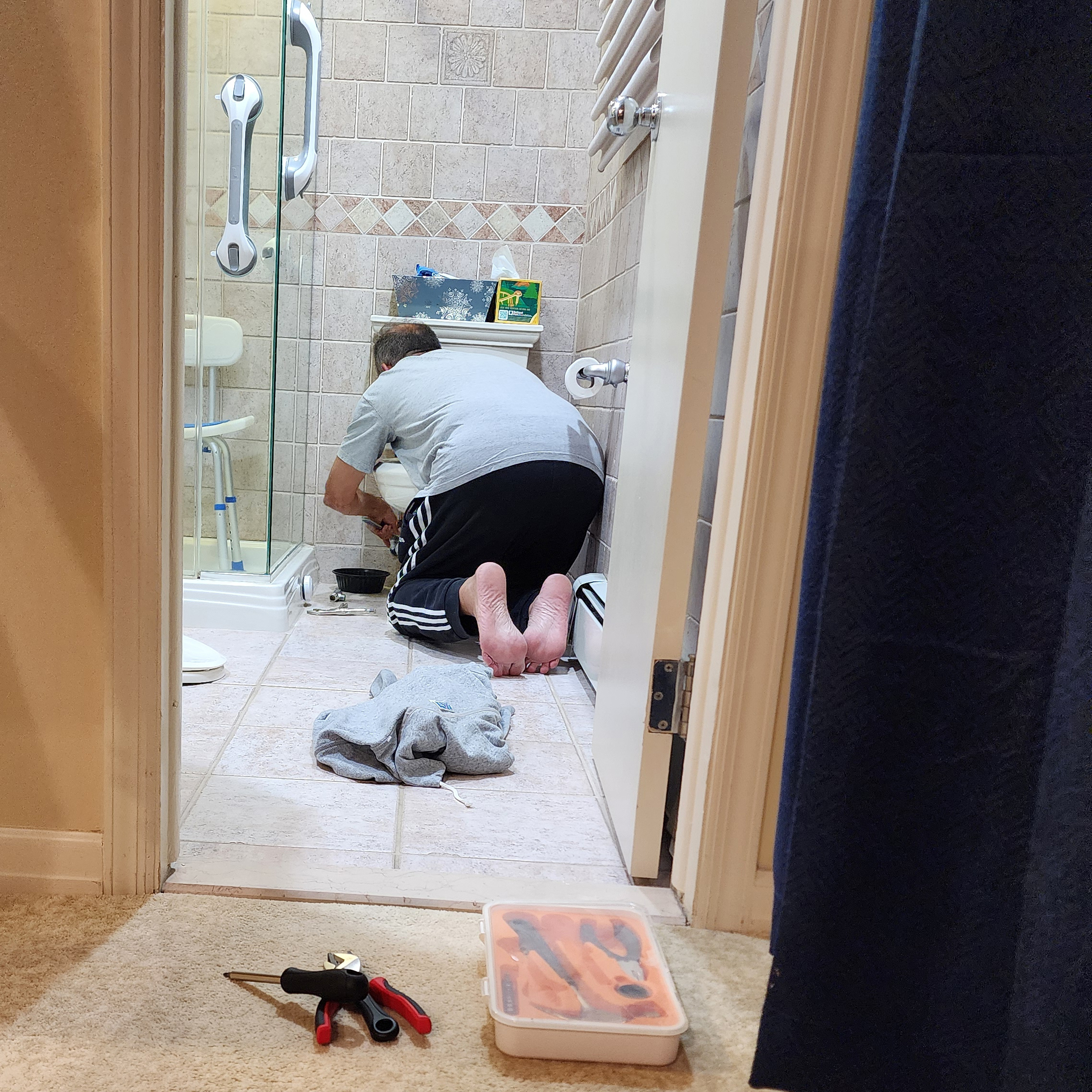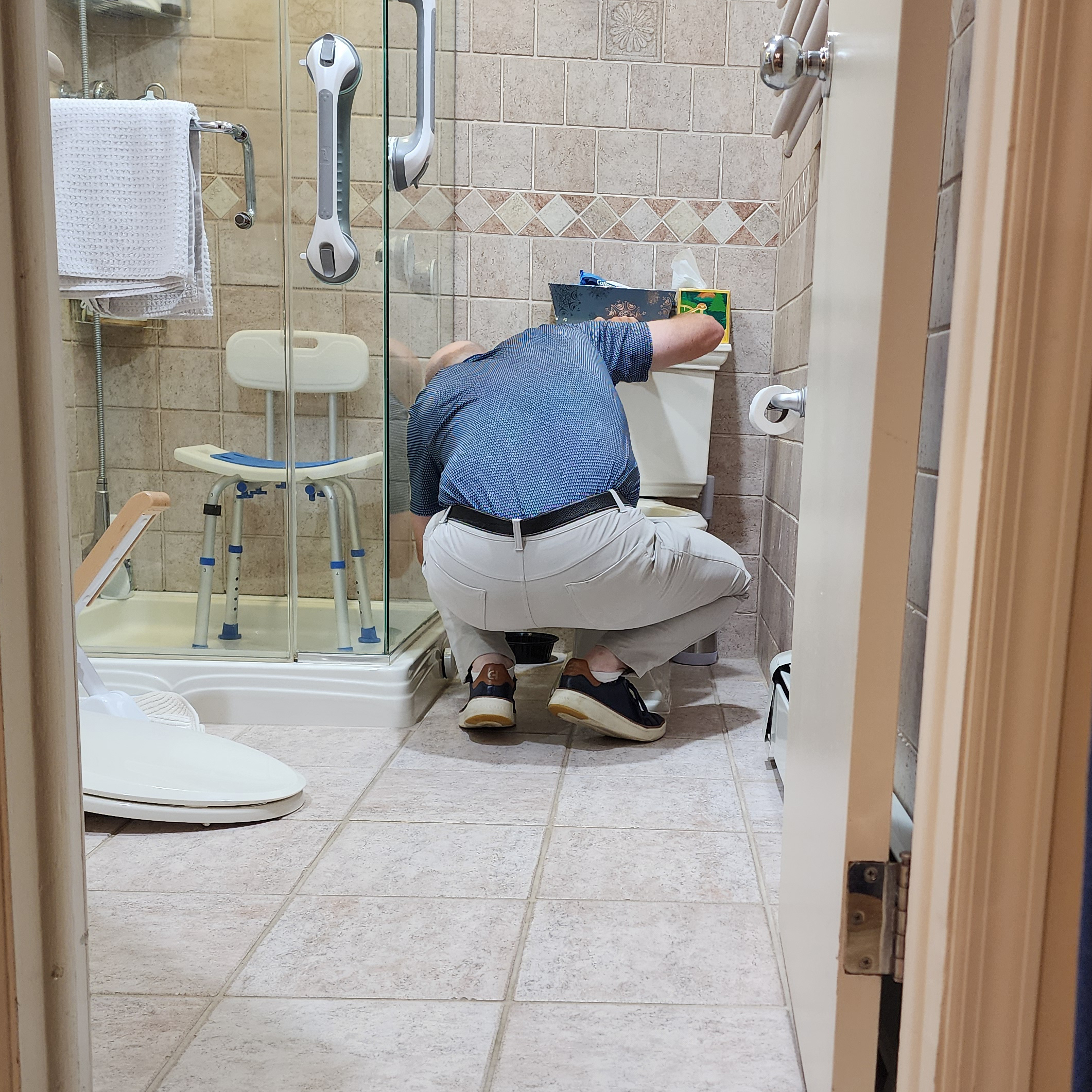 Tuesday night was the same as other nights – and I had to remove my underpants at one point. Not sure what time I took the Radicava, but by 8:30 we got to the shower (Amy used the wheelchair), washed off, got back in the wheelchair (after a bit of time on the toilet), Amy took me to the bed, got dressed, and then I used the walker to get to the kitchen. Kathy (our housekeeper) was there, and Amy asked her to put my compression socks on, which she was happy to help with. After breakfast, I went to my office, and Amy had things to do. When she got back, my parents came over to spend a little time with me, and then I went back to the office. Around 4:00, a gentleman came by to see about reconfiguring the bathroom. At 6:45, she started making me a White Castle dinner. After I had two ice creams and RSO, I brushed my teeth in the kitchen. After I got up (which is getting more difficult), I went to the bedroom, sat on the edge of the bed, and Amy got me ready. Then, with her help, I got on the bed. My legs are swollen again, so she put ice on them, and finally massaged them. I went to sleep.