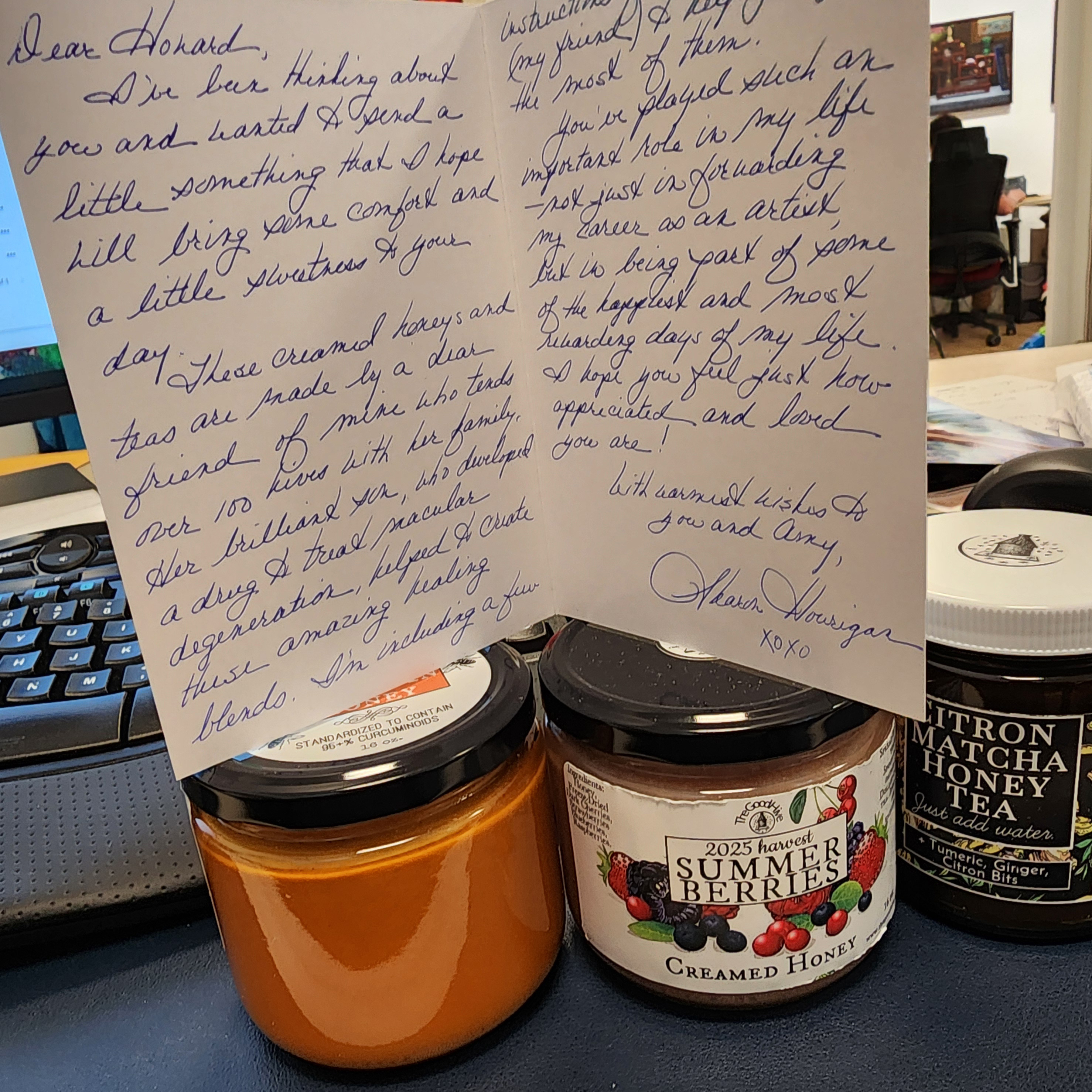 On Wednesday, I woke up a couple of times, but I was using a different urinal, and it worked well. I got up about before 6 and took the Radicava; then fell back to sleep, and we started the process around 8:30. Amy had to roll me into the bathroom (my feet are so swollen that my left foot does not lie flat on the floor, it tilts left). After we were done, I got dressed and then walked to the kitchen – it took so long. I ate my breakfast (the shaking of my hands made it so difficult), brushed my teeth, and then got on the chairlift. It took a bit of time to get to the car. We arrived at the gallery around 12:30, and my daughter put on my compression socks. I also received a lovely gift from an artist – Sharon Hourigan! I had my Doxy, followed by lunch 2 hours later, and then some gelato. We headed out around 5:20 and got home before 7:00. Amy made me some dinner, and while I was eating, a young gentleman arrived who would live here during the week to help me. Amy talked to him for a while, and then he went into the kitchen to meet me. He will start on Monday! After, I had some ice cream and the RSO. Then I made my way to the bedroom with the wheelchair. Amy helped me get into bed, and after that, I went to sleep.